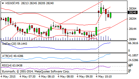 The movement of Hang Seng index closed lower today at 9:18 points, or 0.03%, which is 28123.82 points from its previous close at 28133.00 position to reach the highest point at 28343.74 and the lowest point at 28017.20 points. Likewise, the movement of the Hang Seng Index futures today closed higher by 61 points or 0:21% which is 28 153 points from the previous penutpan position at 28 092 points to reach the highest at 28 353 points and the lowest was 27 953 points.